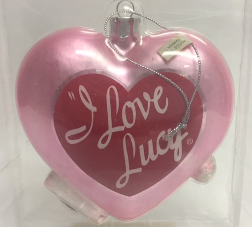 This retired Jumbo I Love Lucy Chocolate Factory ornament will be a great hit! It features a light pink heart with the Lucy's Chocolate Factory logo. The "Lucy's" is done is white glitter and there are three chocolate truffles falling off the conveyor belt. Vintage and in excellent condition. The back of the glass ornament features the I Love Lucy heart logo.